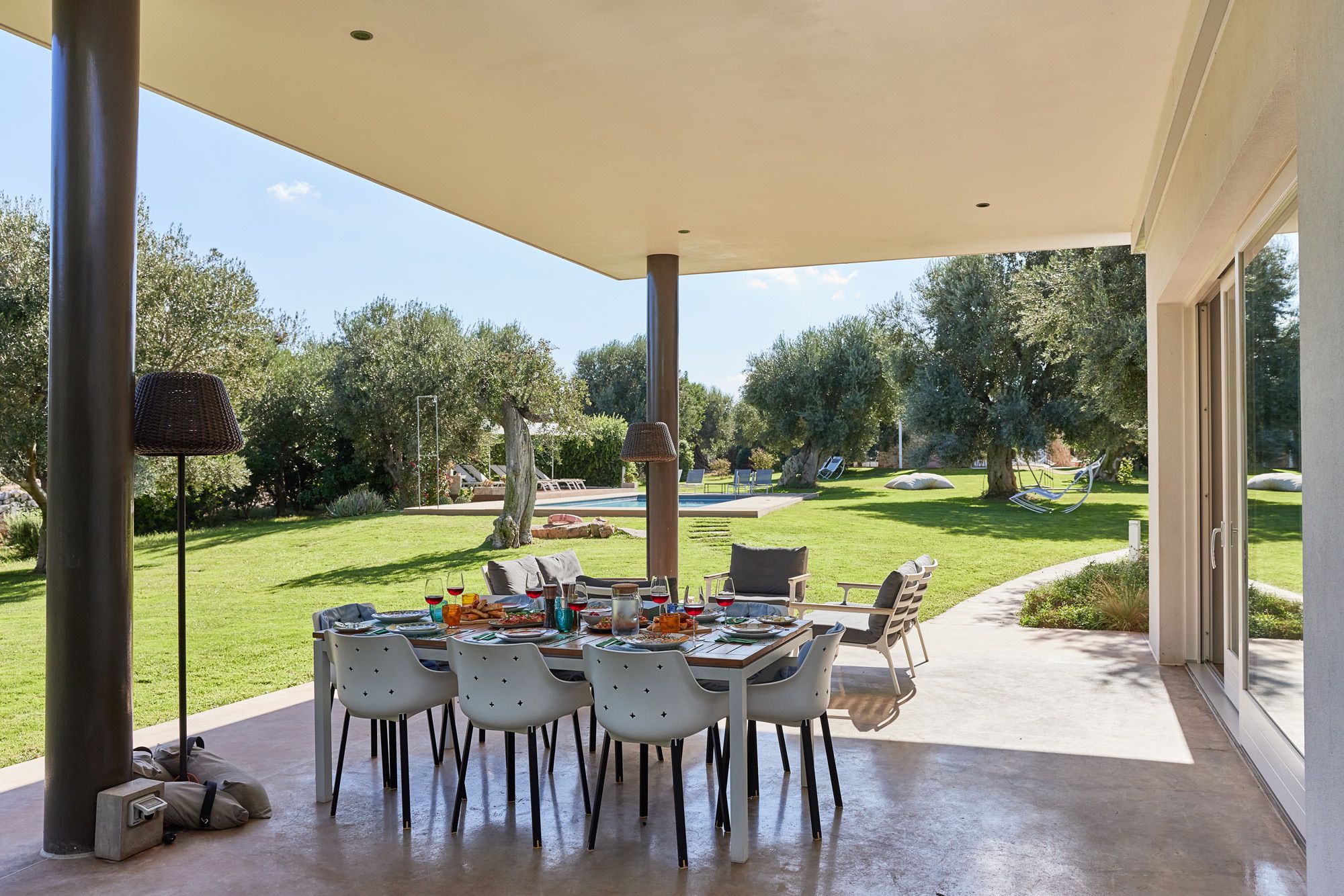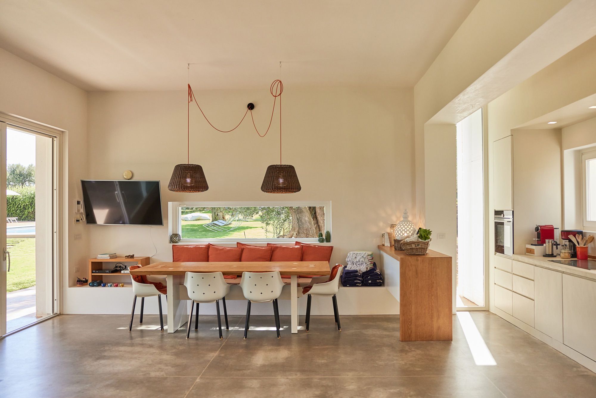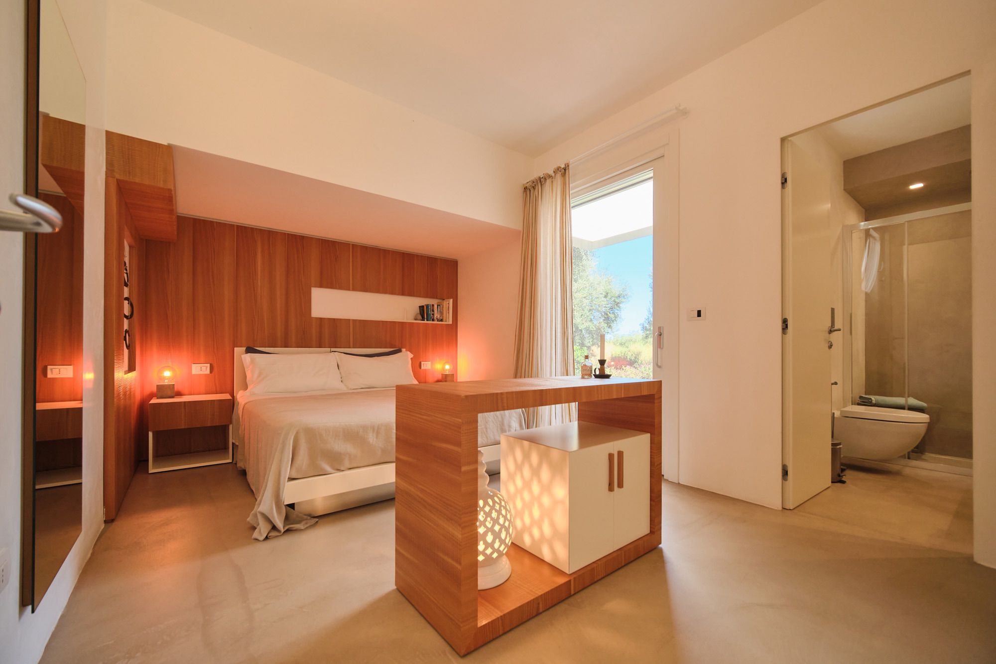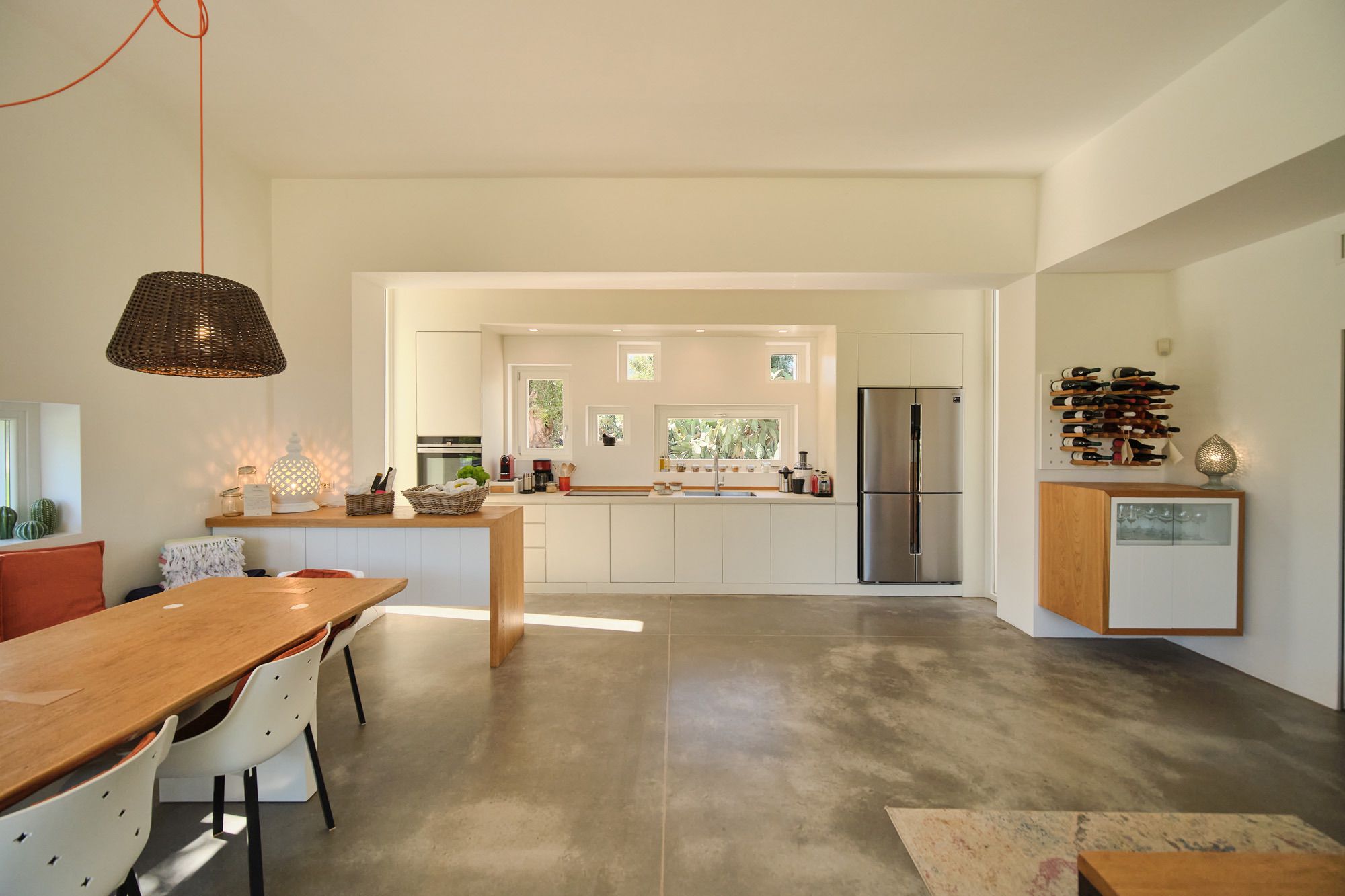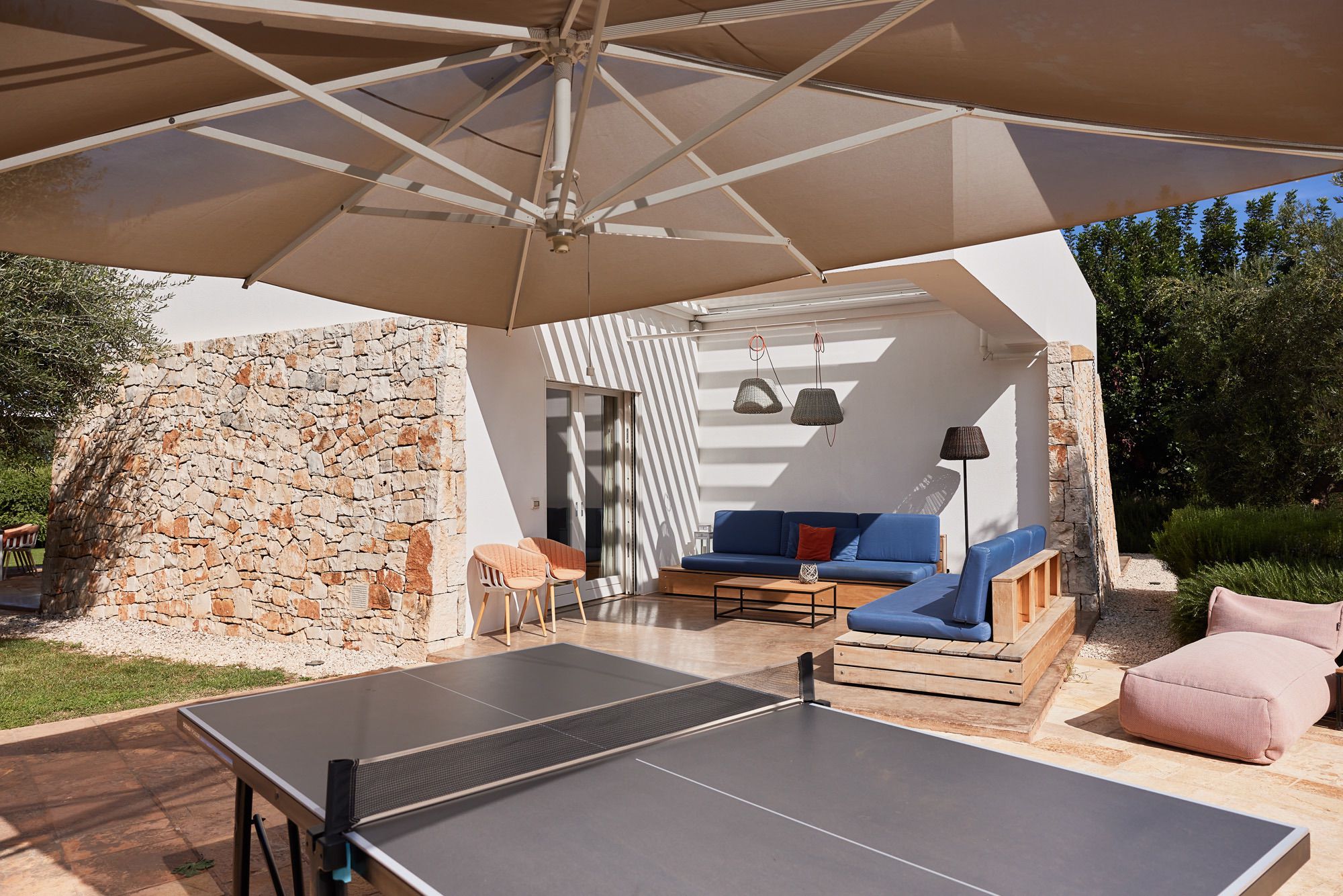 The day house, situated near the pool, includes a spacious, modern kitchen-diner and living area, in addition to a double-twin bedroom and shower room. Its polished concrete floors, contemporary furnishings, and huge windows create a soothing, contemporary ambience.