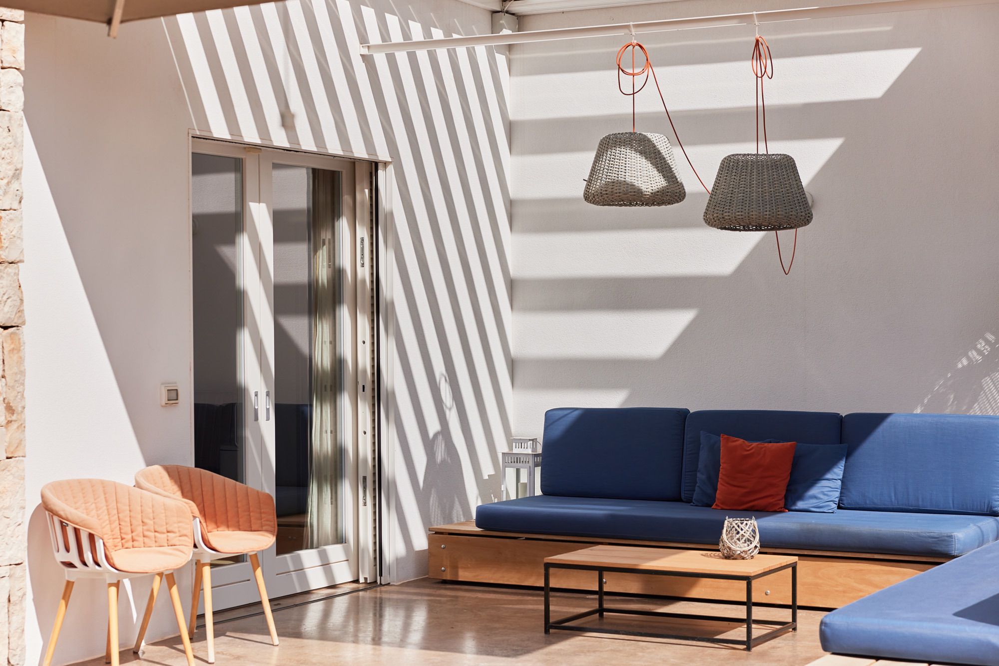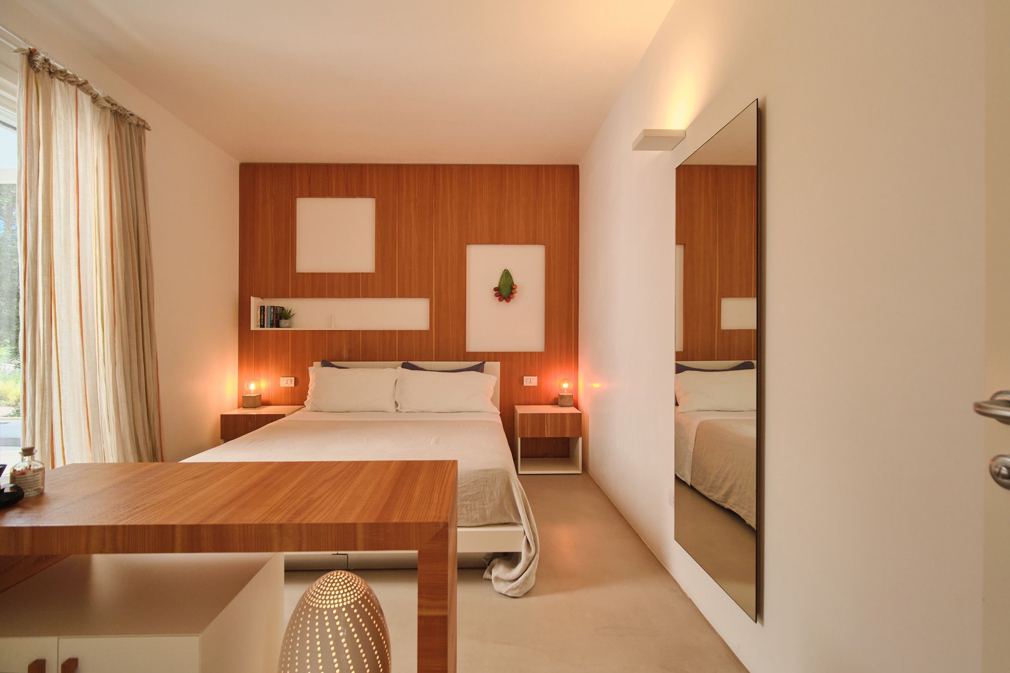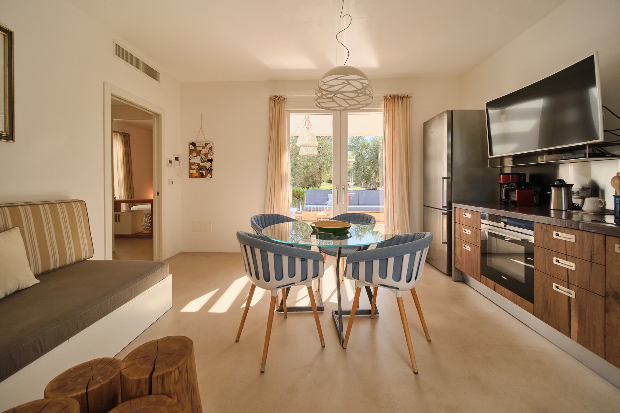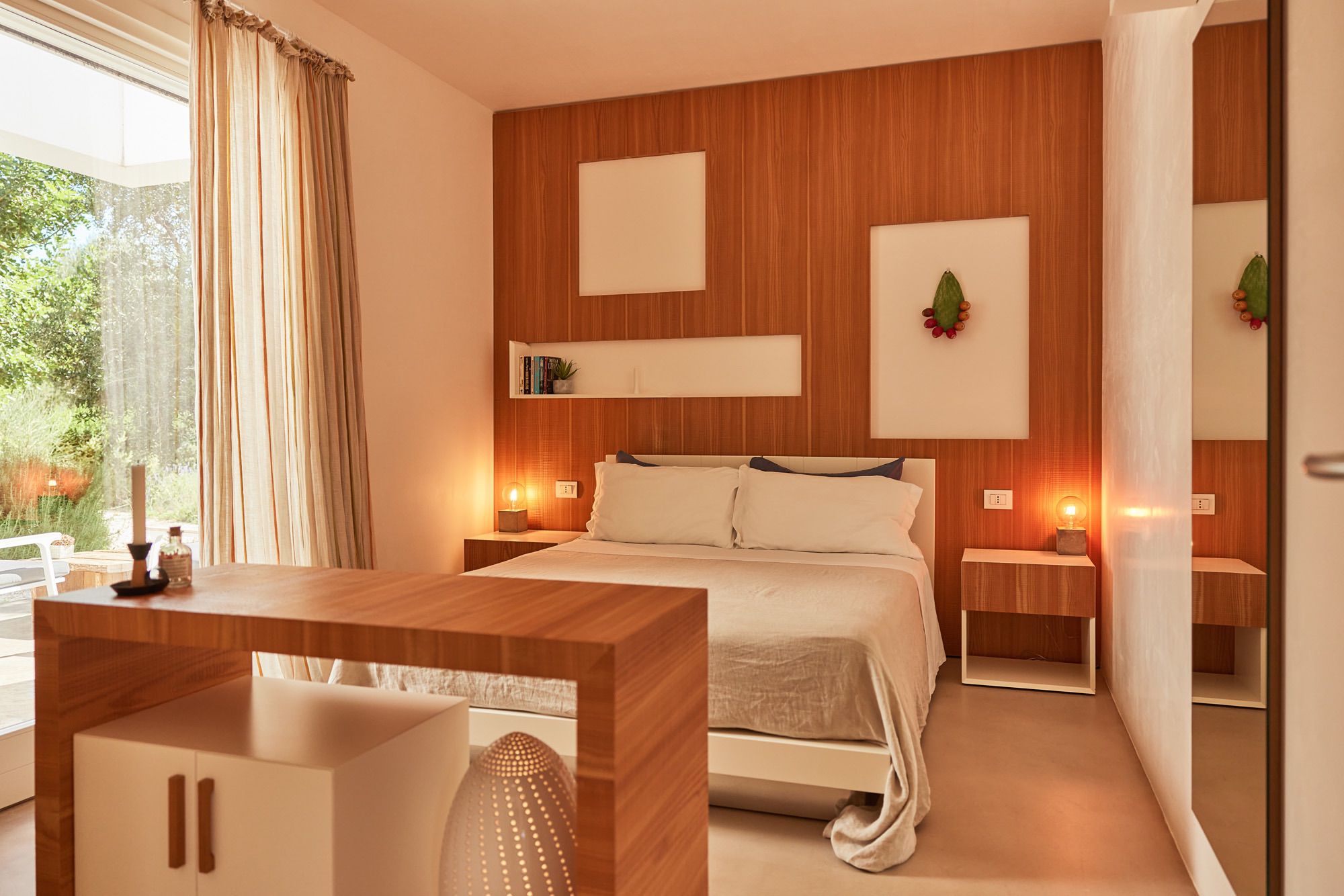 The day house, situated near the pool, includes a spacious, modern kitchen-diner and living area, in addition to a double-twin bedroom and shower room. Its polished concrete floors, contemporary furnishings, and huge windows create a soothing, contemporary ambience.