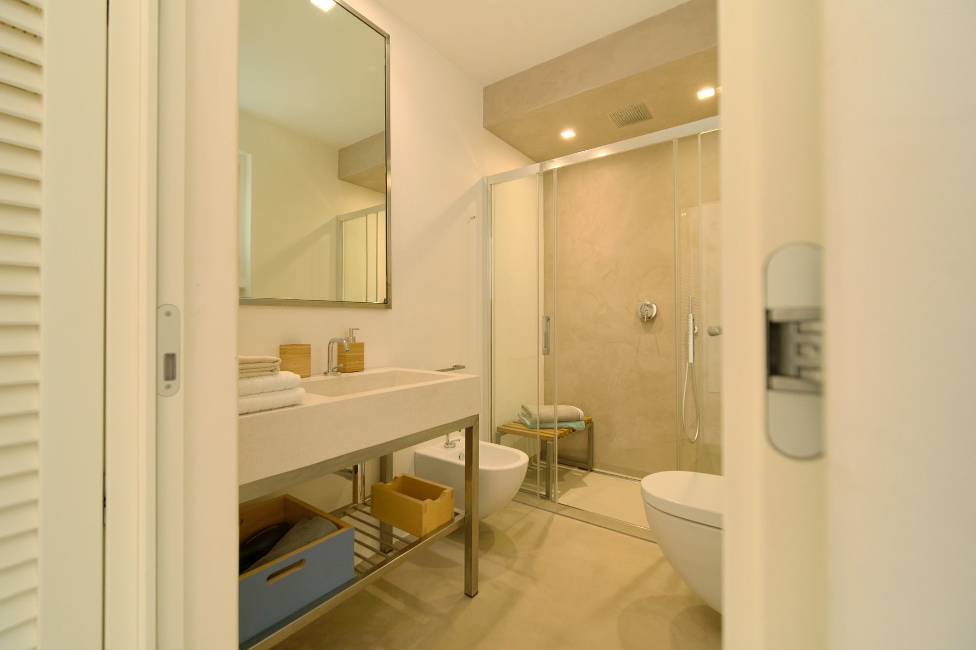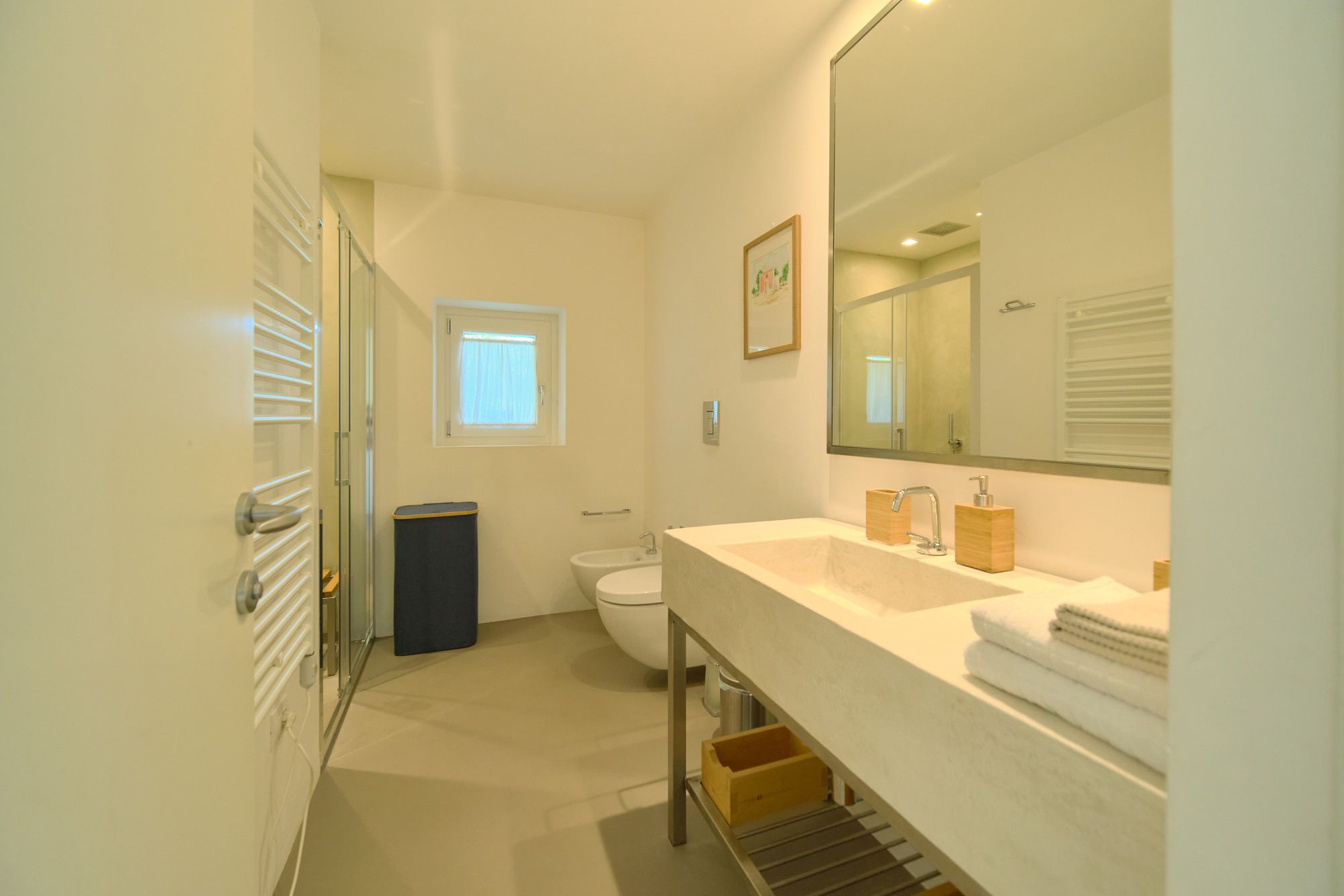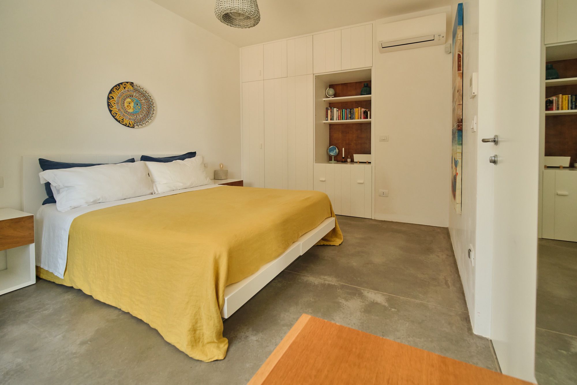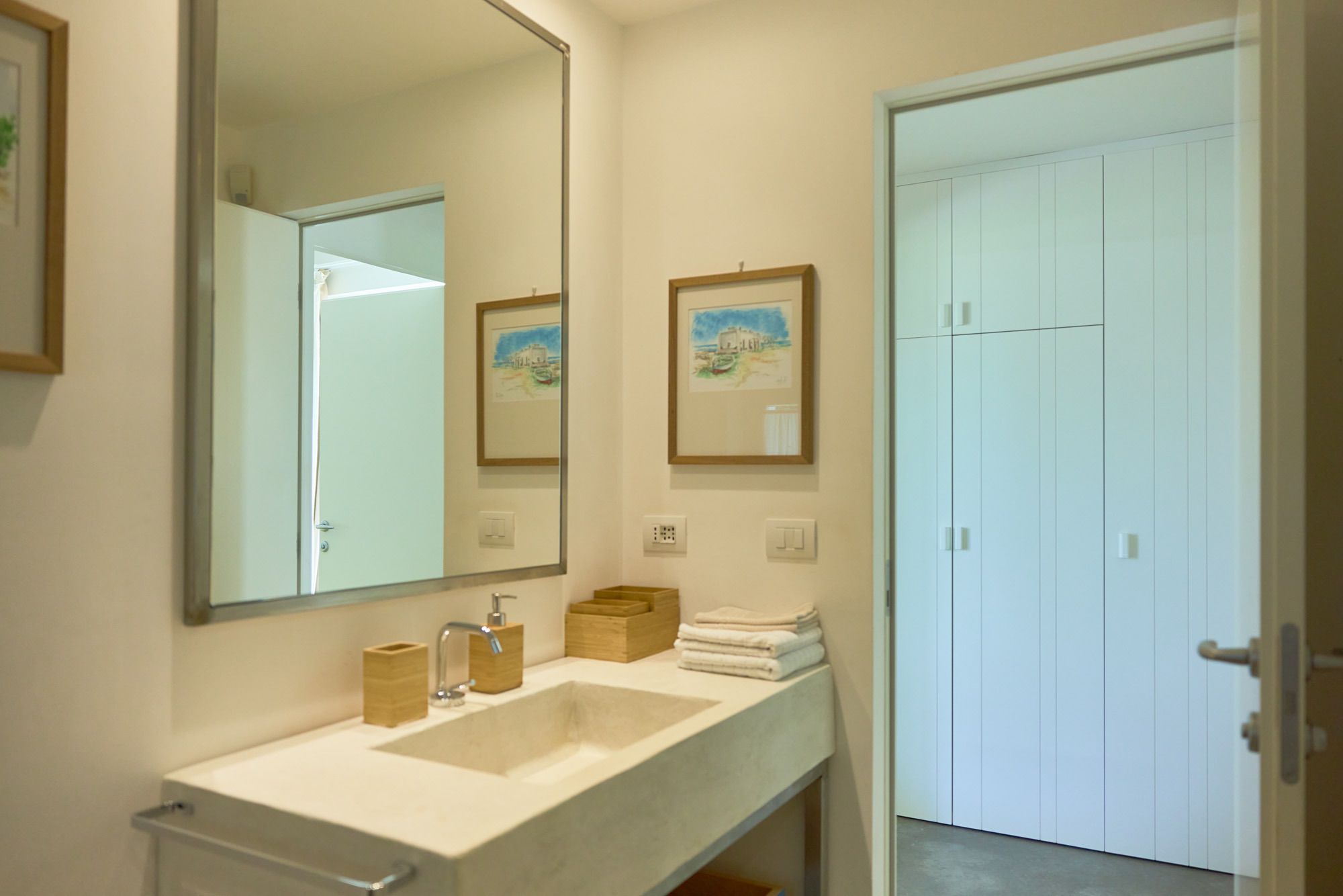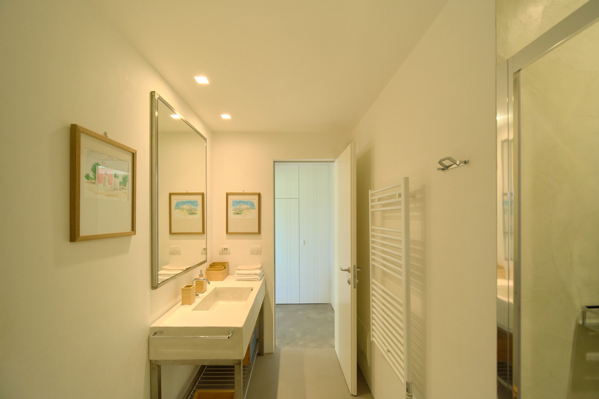 The day house, situated near the pool, includes a spacious, modern kitchen-diner and living area, in addition to a double-twin bedroom and shower room. Its polished concrete floors, contemporary furnishings, and huge windows create a soothing, contemporary ambience.