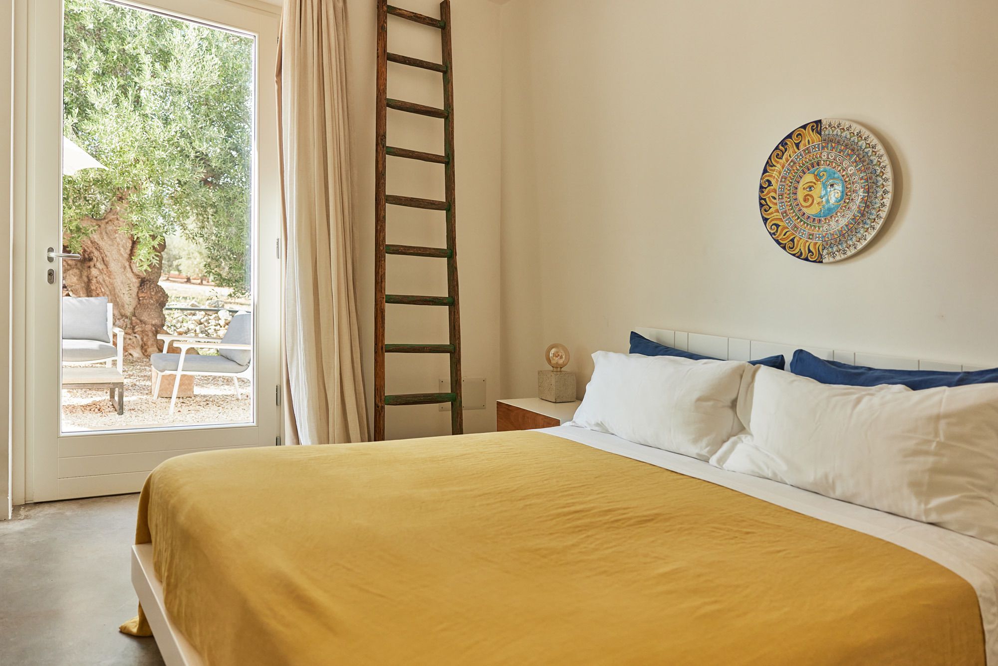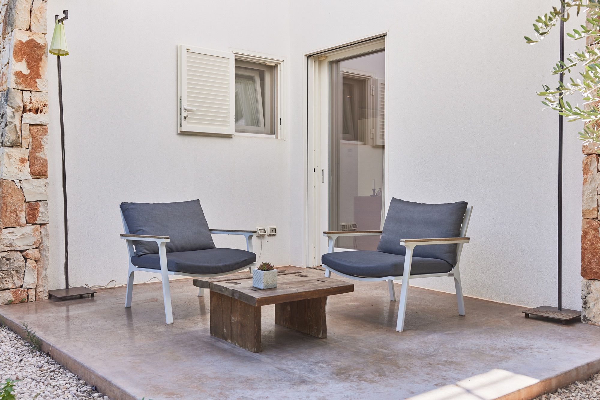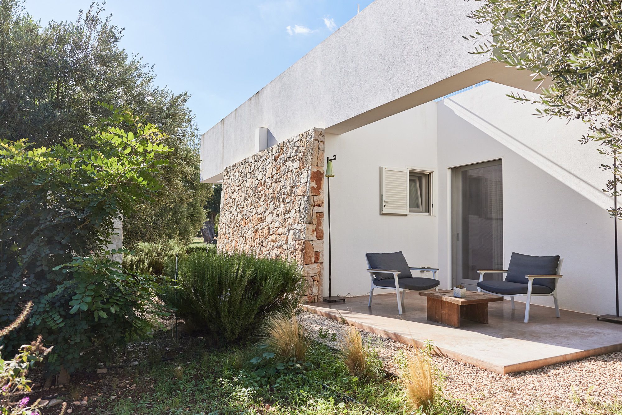Outside, the grounds are dotted with olive trees, plants, and cacti, all connected by stone walks.