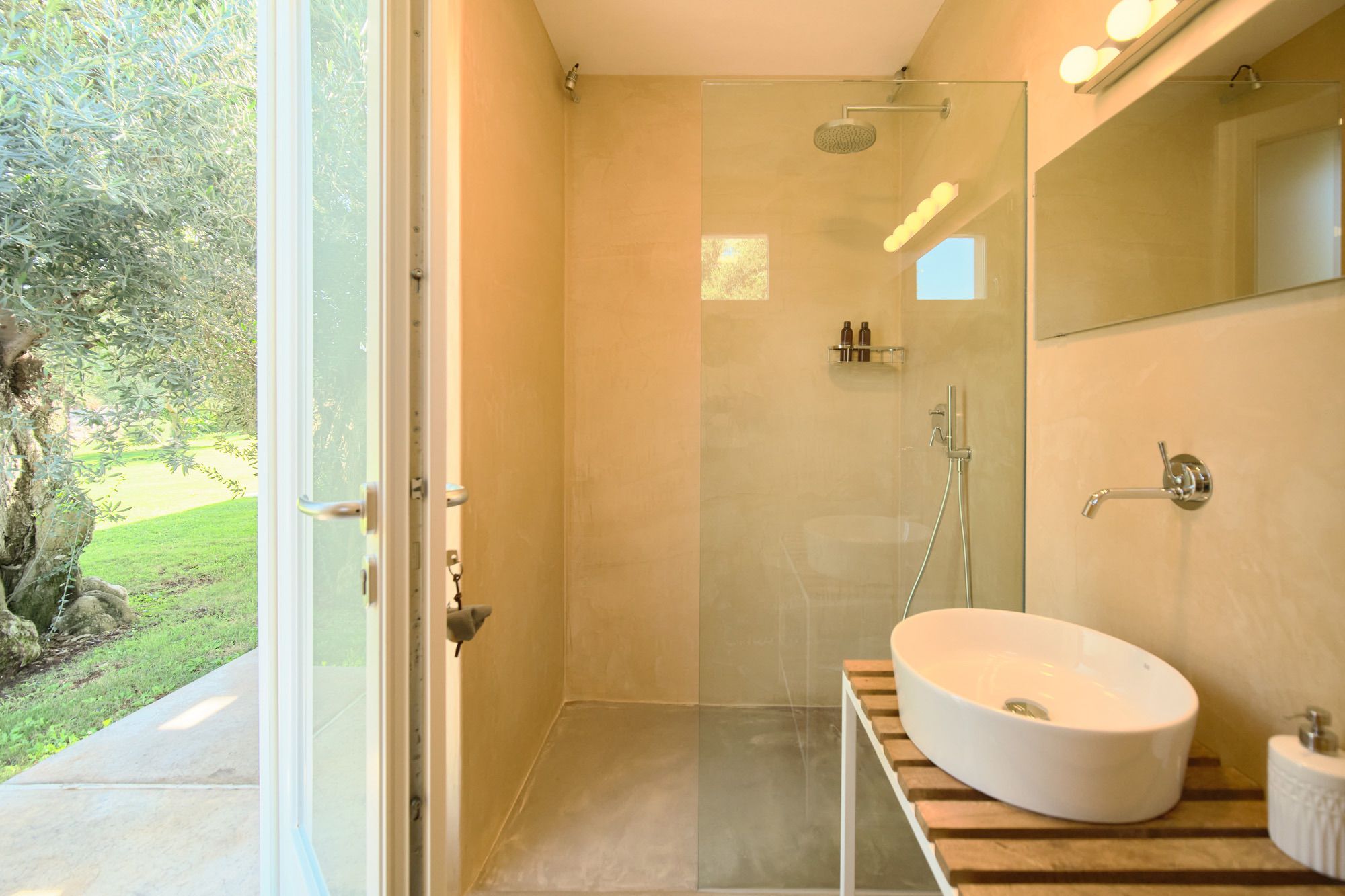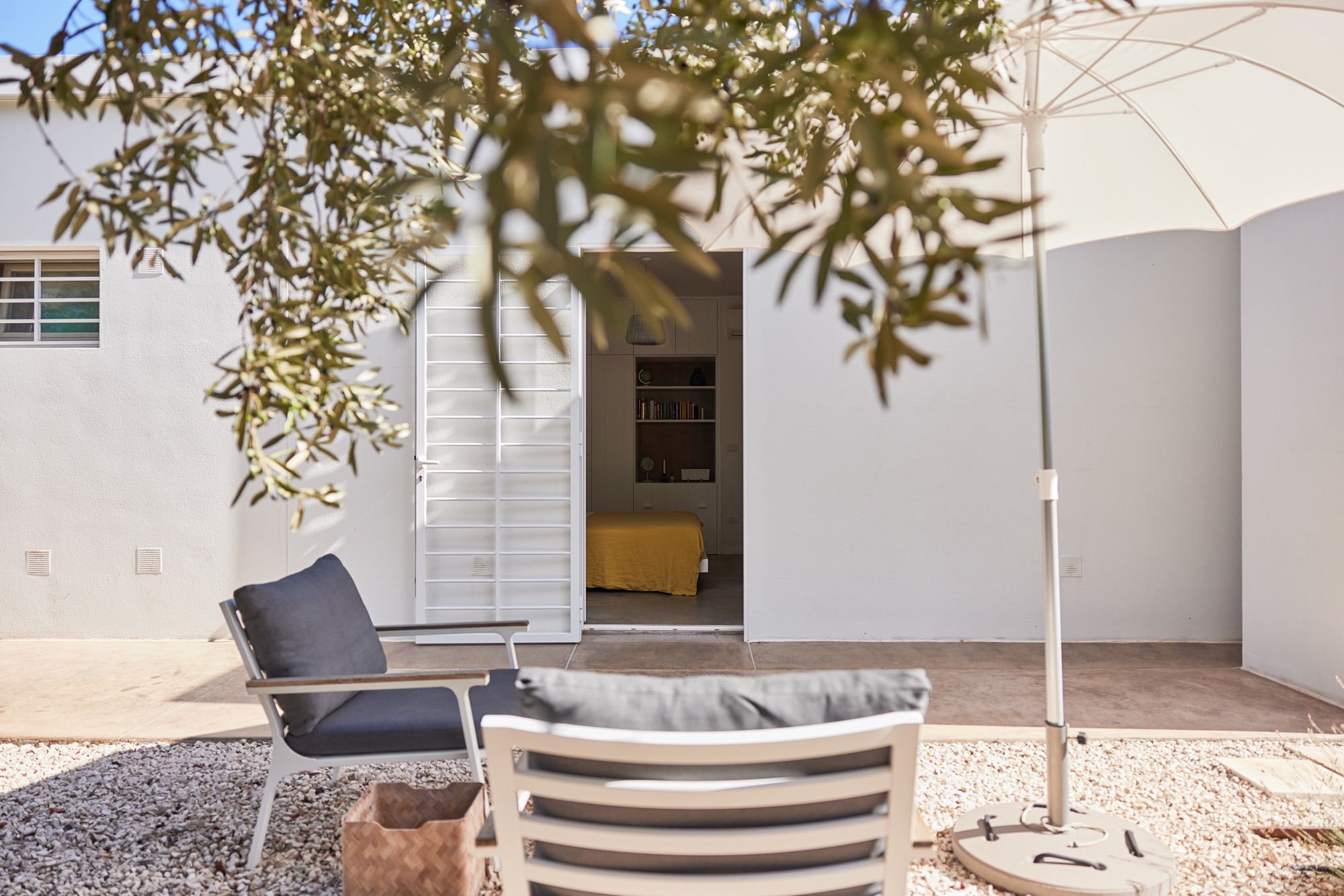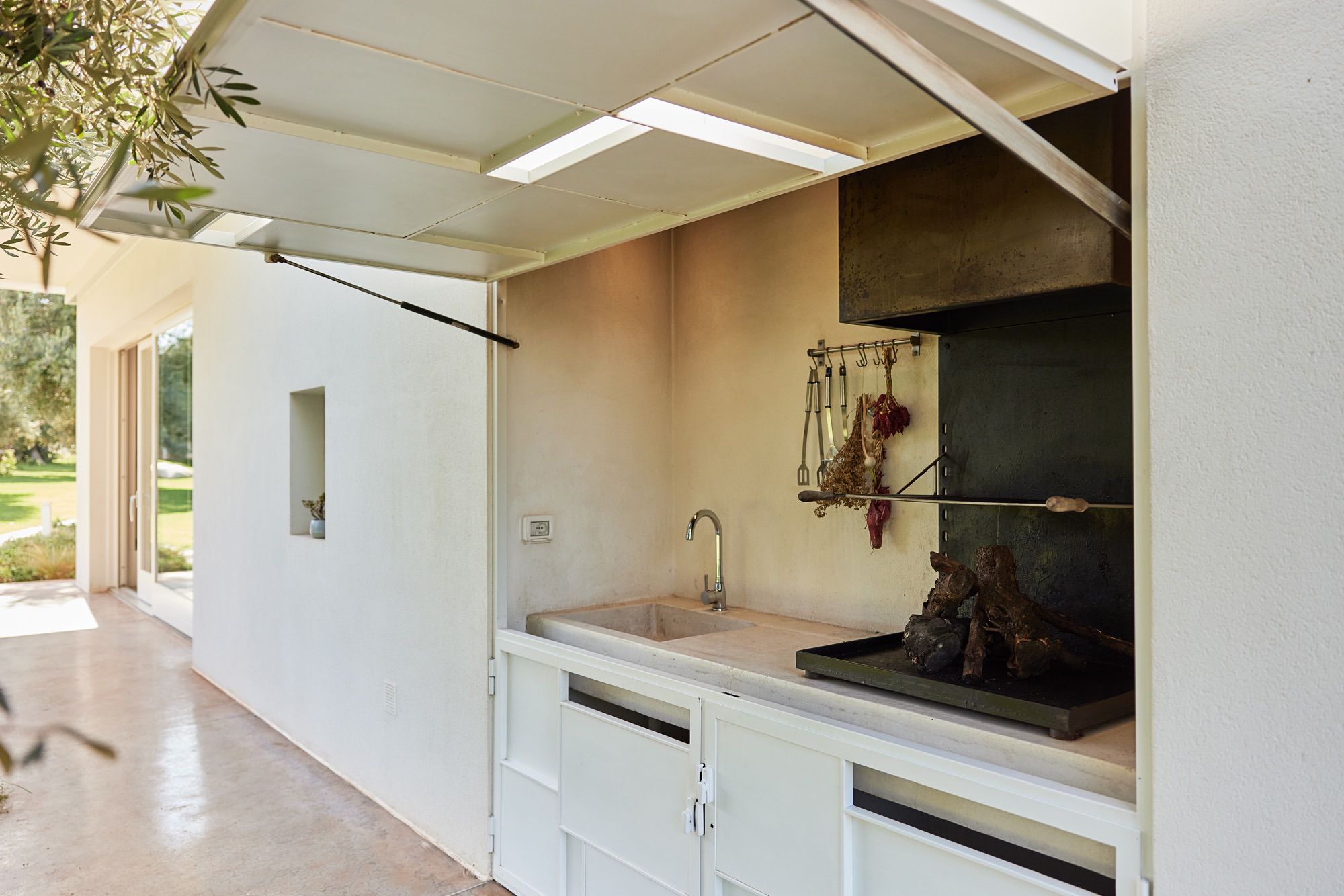 Outside, the grounds are dotted with olive trees, plants, and cacti, all connected by stone walks.